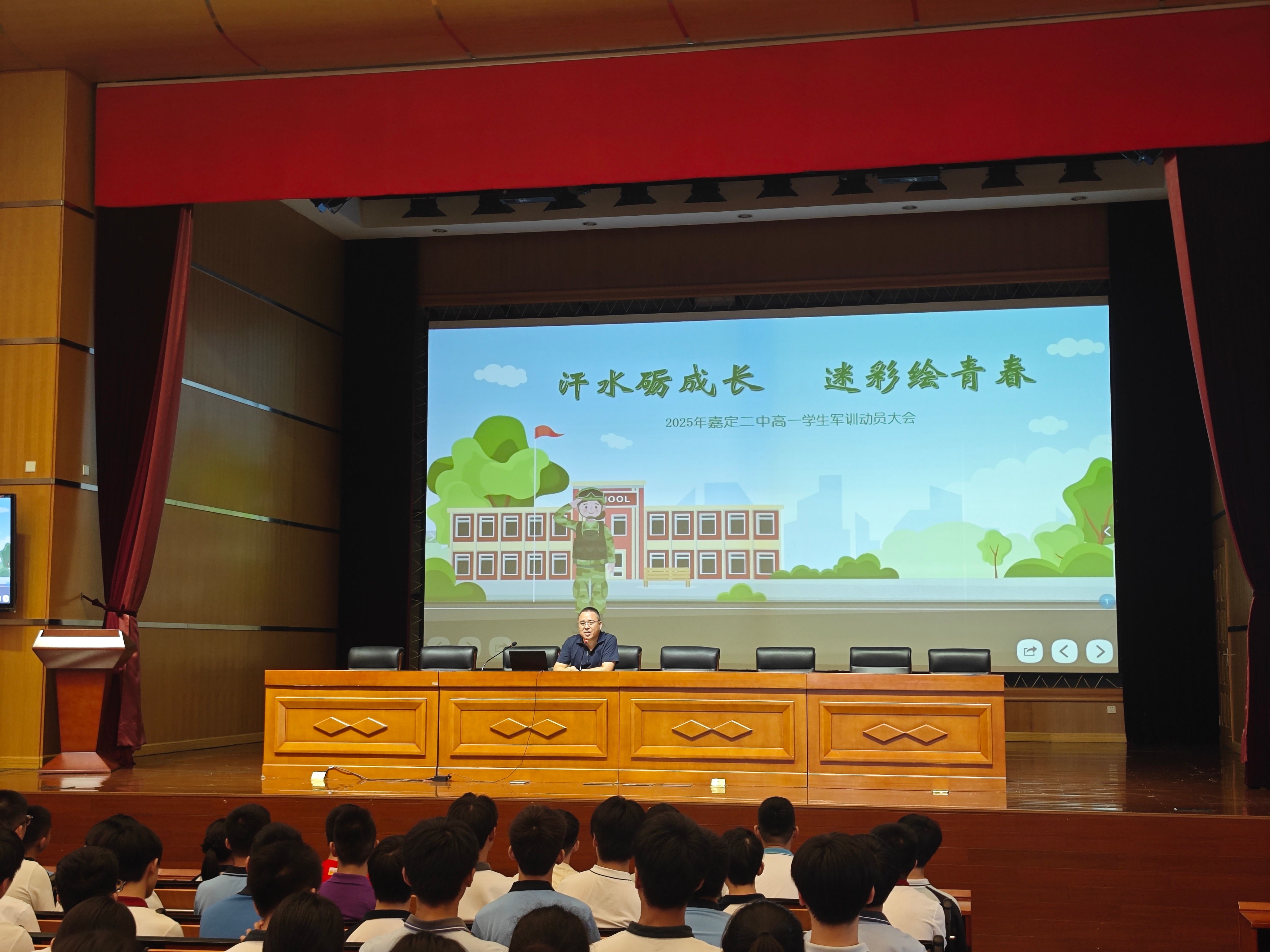 在大礼堂,党总支副书记文朝有热情欢迎新同学,并介绍了学校的发展与文化。他表示,高一新生的精神饱满,给他留下了深刻印象,并勉励大家严格守纪,自律感恩,勇敢追梦,不负青春。他还对未来五天的军训活动进行了动员,强调军训的重要意义,鼓励同学们在训练中锻炼体魄、培养团结与坚韧,同时注意安全,听从指导,在挑战中成长收获。