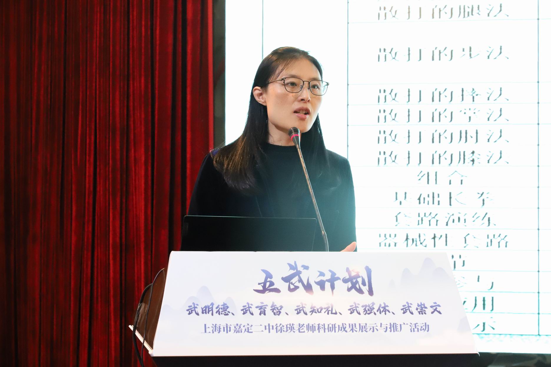 徐瑛老师以“五武计划:武明德、武育智、武知礼、武强体、武崇文——高中体育武术专项化的模式构建与实践探索”为题,从研究问题的提出、研究的过程方法、成果的主要内容、成果的应用效果以及成果的辐射推广情况等角度进行了的成果汇报。