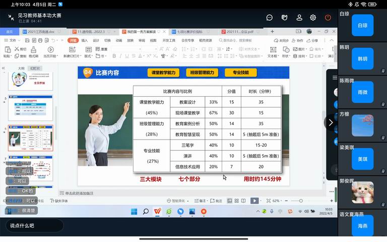 2022年4月5日上午,嘉定二中见习教师规范化培训第二次“云上相见”。基地邀请到2020学年嘉定区优秀见习教师、封浜高中白琼老师开展线上培训。白老师从“我的第一秀”见习教师基本功大赛方案解读、评价指标细节和亲身比赛经验等三个方面,与青年教师们进行了深入交流,分享了自己在比赛过程中的宝贵经验和心得体会。