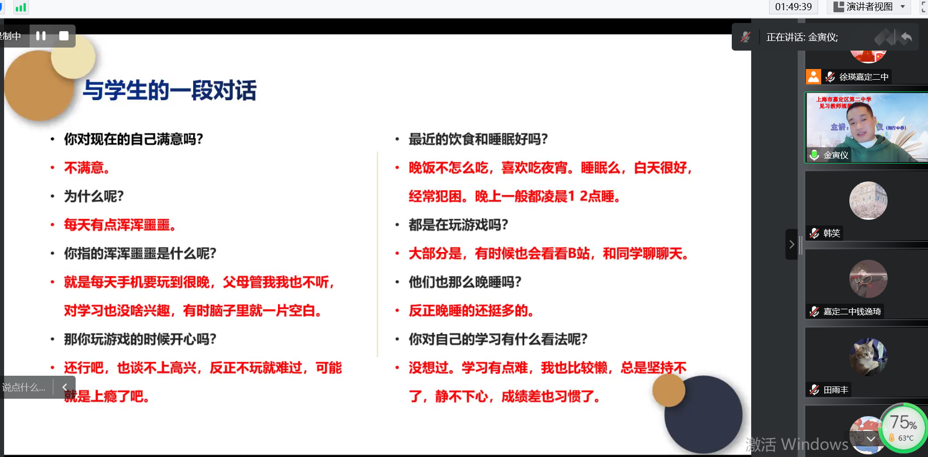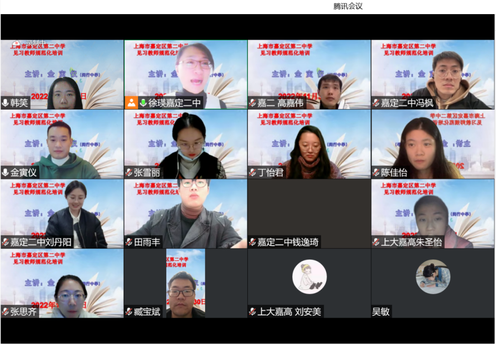 11月30日晚间,嘉定二中见习基地如期开展了定期的见习教师规培活动。在本次活动中,基地的全体见习教师在腾讯会议聆听了闵行中学金寅仪老师主讲的“班级指导原则的制定与执行”线上专题讲座。活动由嘉定二中师训管理员徐瑛老师主持。