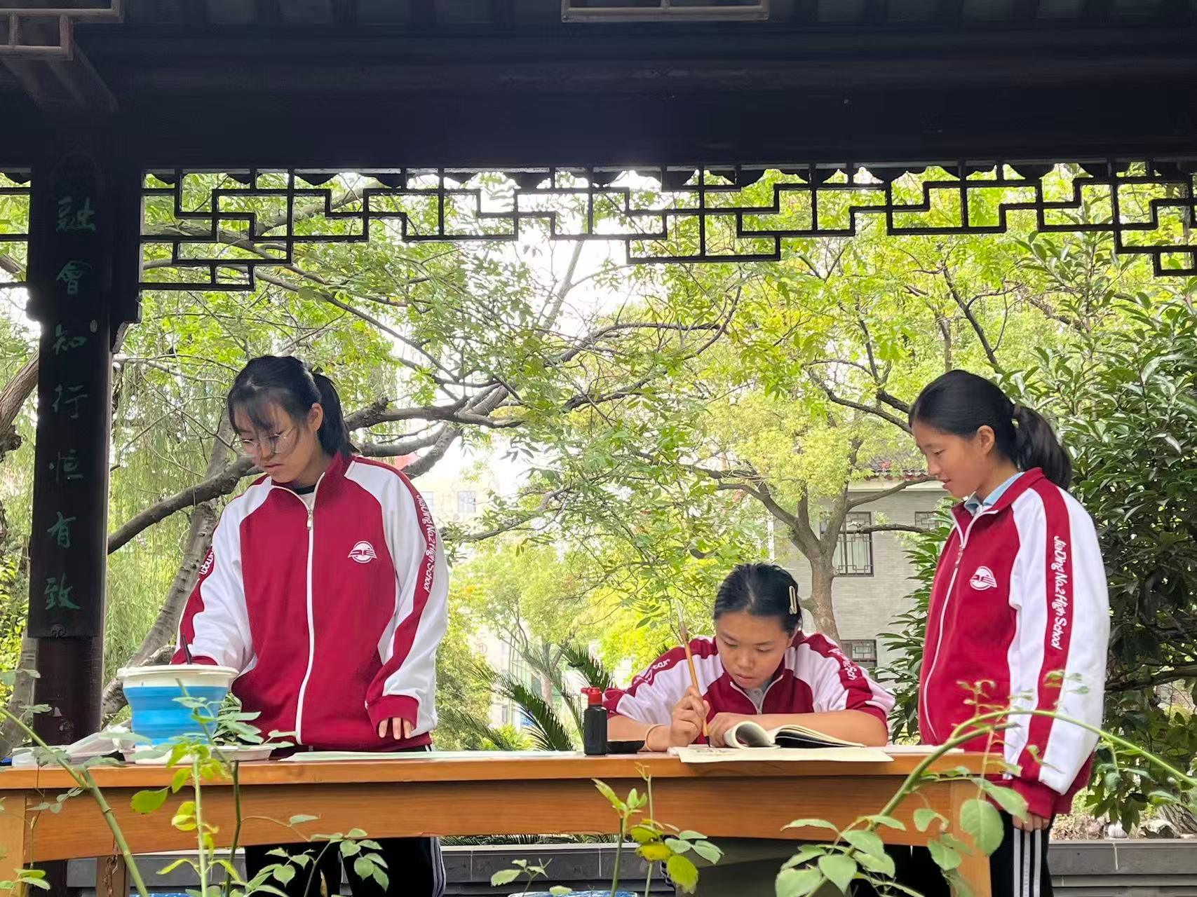 “古韵新潮,青春赋新声”2025年嘉定二中校园艺术节期间,李园长廊户外书画展区正式启幕,成为师生热切光顾的“打卡胜地”,以笔墨丹青定格秋日校园雅韵。