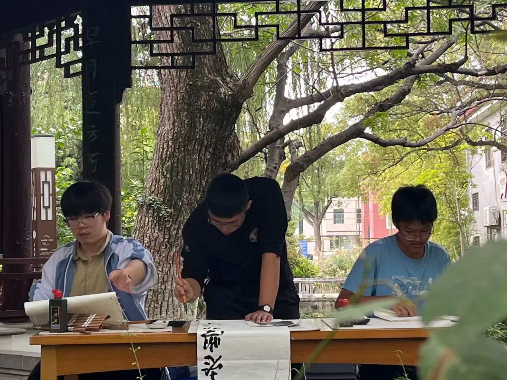 课余及活动间隙,师生们纷纷驻足欣赏:或三五成群轻声讨论笔法技巧,或用手机记录喜爱画作,更有创作者主动分享“听着秋风写书法”的灵感来源,开放式艺术交流在户外自然氛围中悄然发生。数幅优秀作品不仅成为校园文化风景,更以笔墨为媒,传递着“古韵新潮”的青春理解与文化传承。